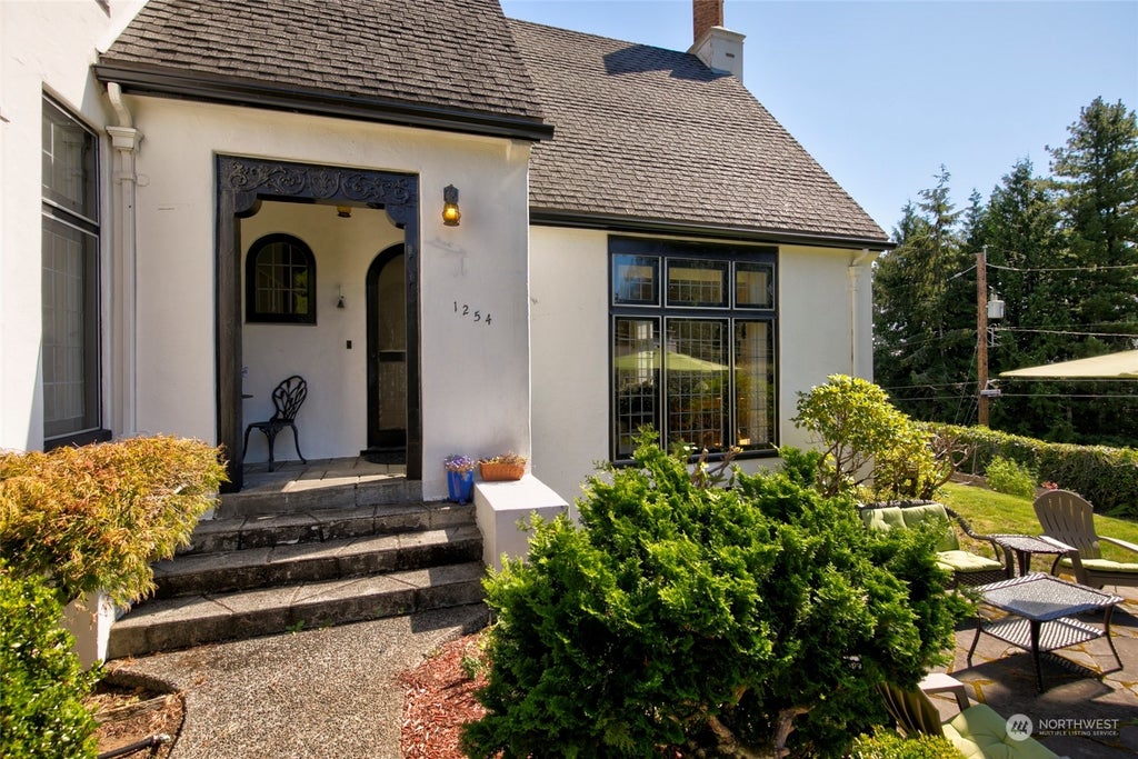 Nestled in Broadway Hill, this historic Tudor home boasts bay, city, and Chehalis River Views. The residence features four bdrms, 2 1/4 baths, hardwood floors, & multi-level flooring. The grand living room is complete with cathedral ceiling, period wood detailing, and an imposing gas fireplace. Leaded glass windows adorn the entire home. The delightful kitchen is equipped with stainless-steel retro ovens and concealed stovetop burners. Mutiple patios, a flat yard, & garden beds enhance the outdoor space. The front is terraced with fragrant lavender, and the property is fully fenced to deter deer, ensuring privacy with a surrounding hedge. Conveniently located close to shopping, parks, and schools. Includes 2-car garage, basement & storage.