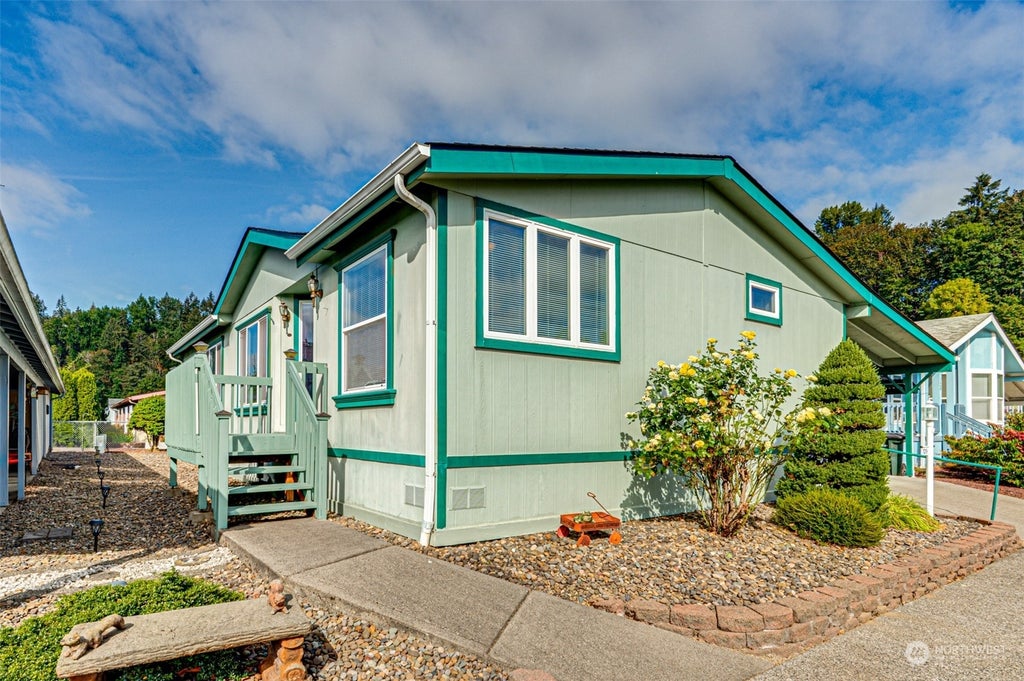 This spacious doublewide manufactured home features an open floor plan with a large kitchen that flows into a spacious living room with vaulted ceilings. Step out from the dining room onto a covered deck, perfect for outdoor enjoyment. The primary bedroom suite includes a jetted tub and a walk-in closet. There are also two additional bedrooms and a full guest bathroom. The yard is easy to maintain and includes raised garden beds. Parking is convenient with an attached garage plus an extended carport. Located in a desirable 55+ park with gated entry and a community area. Recently replaced roof & heat pump make it move in ready! Monthly space rent is $1,250.