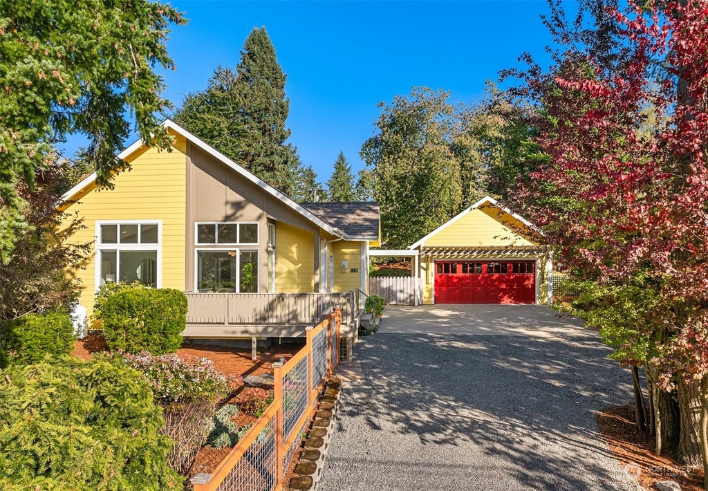 Discover this custom rambler, built in 2005—no steps or stairs! Move-in ready, immaculate home welcomes you w/ warmth. Open the door to a sunlit floor plan w/ soaring ceilings & oversized windows. West-facing big sky views & stunning sunsets + a little peek at the Olympics! The heart of the home is a remodeled kitchen w/ modern appl., bar seating & updated fixtures. Entertaining is easy across hardwoods in open dining & living areas. 3 beds offer flexible use as an office or studio. Outside, enjoy low-maintenance Hardiplank siding, private grounds, a front deck & back patio. An oversized detached garage connects via a covered breezeway. Located on Winslow’s western edge close to parks, trails, beaches & more. Don't miss this charming home!