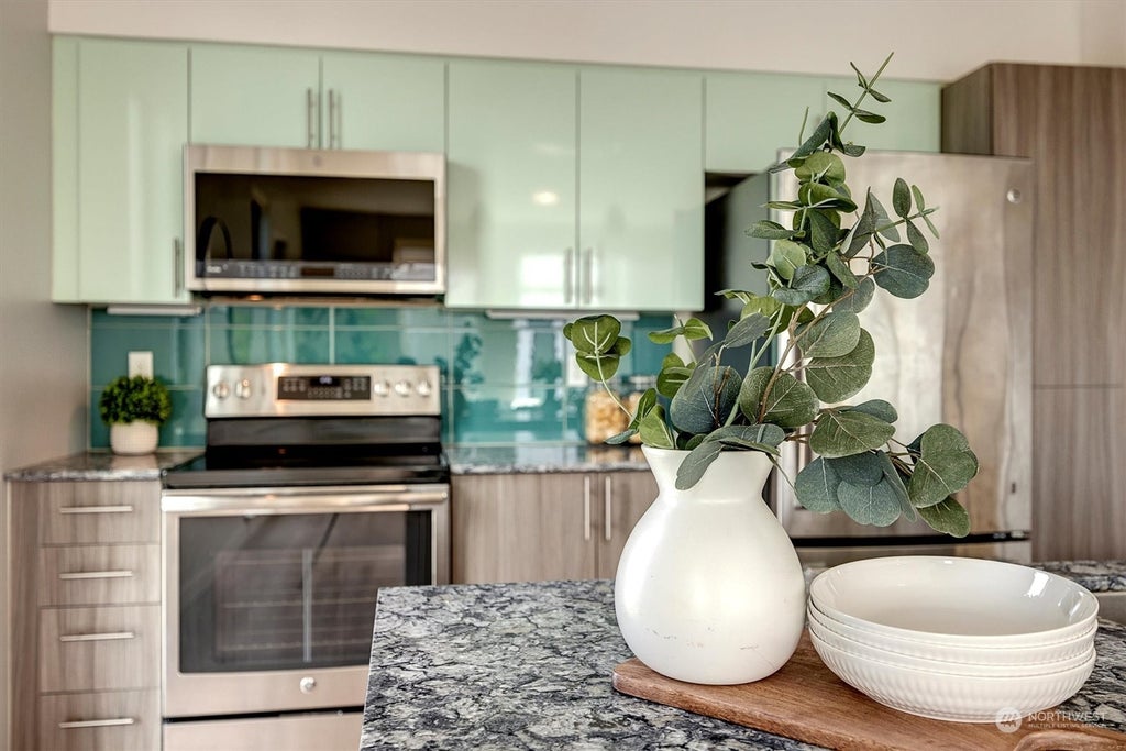 Live, work & play in the heart of Bellevue living at luxury boutique condo! Just 2 blocks N of Bellevue SQ, this SW corner, top floor unit offers plenty of airspace from nearby buildings. The open layout w/floor-to-ceiling windows overlooks a courtyard. The sleek kitchen feat. high-gloss/modern cabinetry, & a view balcony. The primary suite w/a lavish bathrm boasts ceramic walls+large WI-closet. Unrivaled amenities:Rooftop deck w/sweeping 360-views, BBQ’s+dog run. Main level feat. a club lounge w/chef-grade kitchen, courtyard & concierge. EV charger sta./pet wash sta.+guest parkings, 1 assigned parking w/storage unit. Located in the most evolving+vibrant neighborhood in Downtown, just a block from the new iconic Intercontinental IHG Hotel.