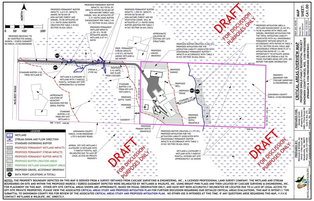 REDUCED PRICE! Here is the perfect private wonderland to build your dream home! Minutes from I-5, this mostly level 5+ acre parcel is close to downtown Arlington. Much of the paperwork has been done by the seller (Surveys, Wetland & Wildlife Studies) and plans submitted to the county for permits, including locating the well, house footprint and 4-bedroom septic – see all docs in the Supplements. In place is a 30-ft easement on the north side of 17213 McElroy Road for access. Close to shopping, dining and all amenities, this property will make a beautiful, very private building site for your new home