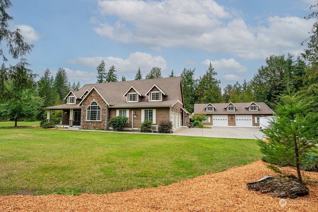 Discover this exceptional rambler home featuring 2,866 sq ft of living space, complemented by a 2,440 sq ft shop. Home boasts vaulted ceilings & skylights. Living room is highlighted by a floor-to-ceiling stone fireplace w/ a wood-burning feature. The gourmet kitchen is a chef’s dream, equipped w/ double ovens, stylish cabinets with accent lighting, & a convenient eating bar. The primary suite is spacious & inviting.Additional amenities include a heat pump with air conditioning and two more gas fireplaces for added comfort.Step outside to a large covered deck, perfect for entertaining or relaxing. Shop is equally impressive, offering a full bath & a large unfinished space upstairs that could be transformed into an ADU. Heated garage & shop.