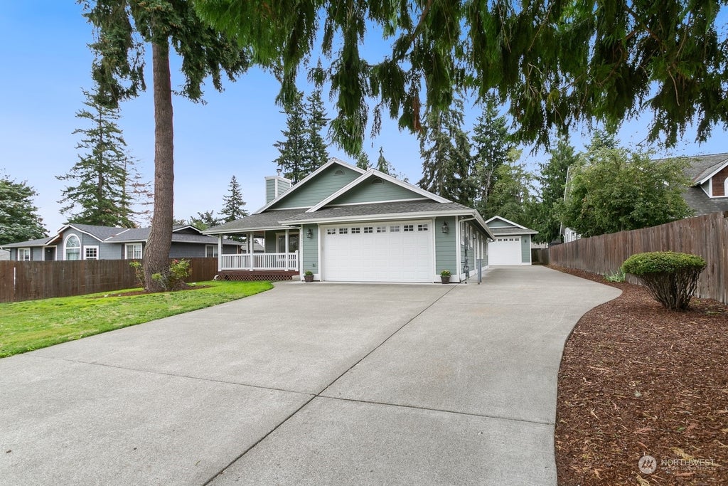 Custom built single story! Slate entry to living room w/vaulted ceilings & skylights. Beautiful & spacious kitchen w/engineered hardwood floors, granite counters, eating bar, gas stove & S/S appliances. Primary suite w/vaulted ceilings has a spacious 5 piece bath, jetted tub & walk in closet. 3 sets of French doors lead to a wrap around deck that is covered w/lake views. This is a 1/3 acre lot w/tons of driveway space, and in addition to the 2 car attached garage there is a 4 car detached garage with RV door & clean out-Covered parking for 6 car! A short stroll down the street is the private community gated park has access for all kinds of recreation: swimming dock, athletic court, playground & picnic areas. Fresh interior paint job!