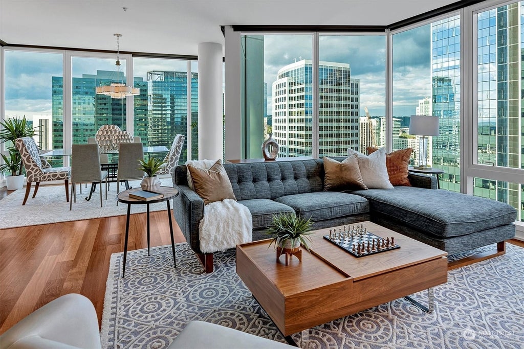 Custom-designed 3-bedroom, 4 bathroom home in the sky at Bellevue Towers! Versatile plan w/walls of glass & views of city/Cascade Mountains + sunrise. Additional wing offers guests privacy with accommodations that include game room, living area, second balcony, wet bar, second primary suite and two additional baths. Chef's kitchen with a Sub-Zero refrigerator, refrigerated drawer & freezer, Wolf cooking, and warming plate. Highlights include WiFi-enabled automated window shades, blackout shades in bedrooms, wine refrigerator & 3 parking spaces + storage. Walk to shopping, restaurants, Amazon, waterfront park and all the best of Bellevue. Newly remodeled amenities include spa, 2 gyms, concierge, theater, 1/2-acre garden & lobby!