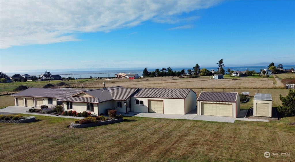 Enjoy panoramic saltwater and mountain views from this well maintained, one level, custom home near the shores of the Salish Sea. Practical floor plan offers comfortable living in this quality-built home. Oversized primary bedroom with spacious en suite and walk-in closet. Office and exercise room are in addition to the 3 bedrooms. FIVE car garage PLUS attached shop or art studio. 2.5 Acres of flat usable land for gardening, entertaining, and more. County Irrigation. No HOA or CCRs. Home Warranty Included.