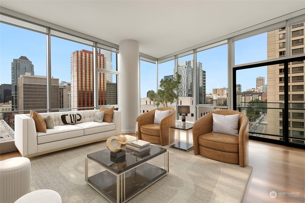 Experience urban luxury in this expansive 1,208 sq ft condo located at 5th and Madison. Sitting above the neighboring roofline, this oversized corner unit offers unobstructed city views and tons of natural light. Located in a prime downtown Seattle high-rise with a strong HOA, this sleek unit features modern finishes, a spacious open-concept living area, and a chef’s kitchen perfect for entertaining. The primary suite includes a walk-in closet and spa-like bath. Enjoy all the benefits of city living with easy access to Pike Place, Pioneer Square and Capitol Hill. Ditch your car in the secure garage and walk to the Link to get around! Building includes 24-hr concierge, lounge, fitness room, pet run and private storage unit.