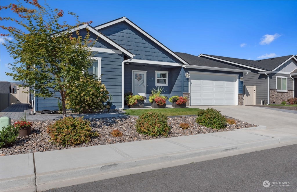 Beautifully planned and improved with spacious vaulted great room with big windows & slider to a covered patio. All flooring updated to durable, waterproof plank vinyl. Custom window coverings throughout including stylish roman shades & woven slider drapery to match. Laundry has added storage/countertop unit opposite washer and dryer. Triple car garage includes a tandem bay & so much storage. Closets/cabinetry throughout are many and very spacious. Pretty electric fireplace warms the great room. Large covered front entry has space for outdoor furniture and pots! Extraordinary landscaping with stone curbing & pavers in both side yards for easy care. Plantings are so pretty in front and back. The extras and improvements will impress!