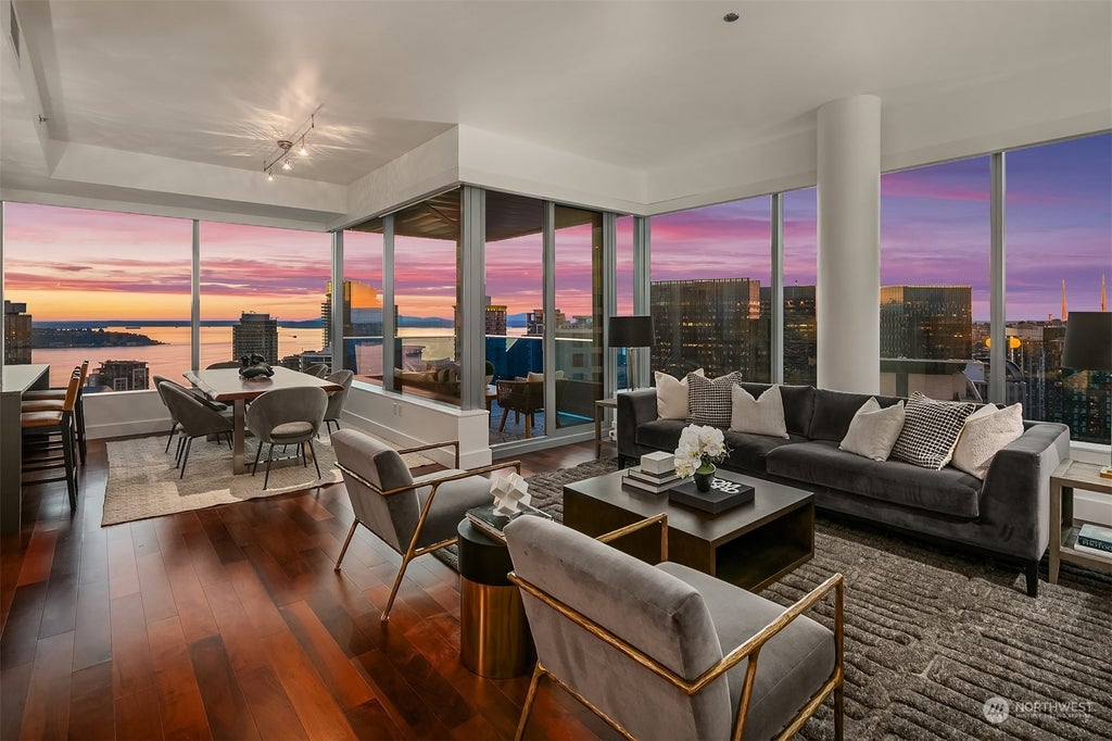 Exceptional penthouse in Olive8, an icon of luxury downtown living. Sweeping views of Puget Sound, Olympics + dazzling skyline. Unwind on private deck as you + your guests watch mesmerizing sunsets. Expansive open concept layout helps create sophisticated interior spaces that soar above the city. Oversized windows, 10-foot ceilings + warm hardwoods offer refined style. Kitchen includes premier Bosch appliances + Pedini cabinets. Indulgent spa-inspired bath + large walk-in closet highlight primary suite. Two additional guest rooms, one with ensuite, and home office space round out well-appointed home. Enjoy access to hotel-style amenities such as 24-hr concierge, room service, gym + lap pool.