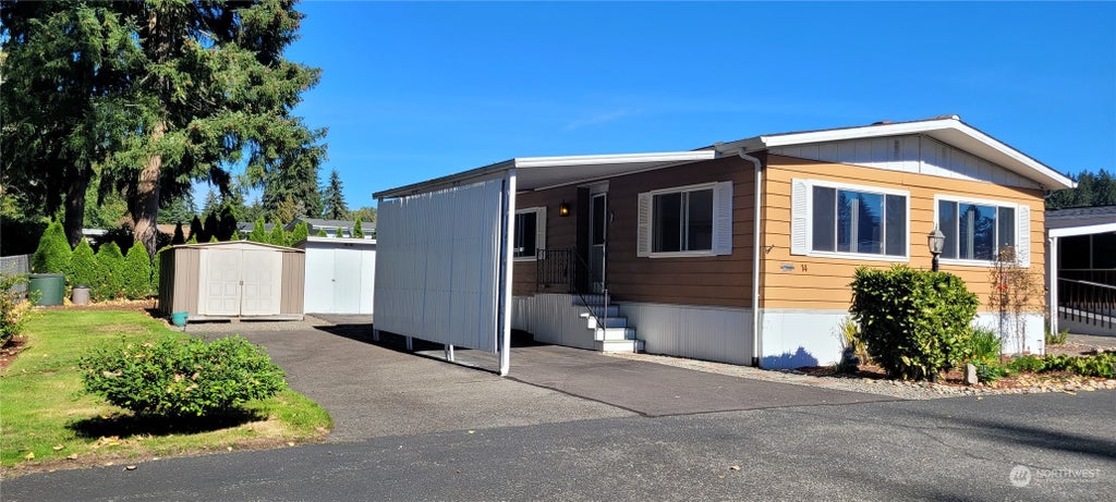 The mobile home is on a sunny, oversized lot at the end of the road next to a lush greenbelt. It features a 1244 sq. ft. with a one-floor plan. The primary bedroom is oversized with a private bathroom. There is a second bedroom and 3/4 bath. New vinyl windows let the sunshine in. Open floor plan with large living spaces. Covered parking in the attached carport. It has a nice side yard next to a green belt. There is a detached shed and garden space in the back. Air Conditioning, a new HVAC unit for your comfort. 55+ Park, The space rent is $1605 and includes water and sewer.