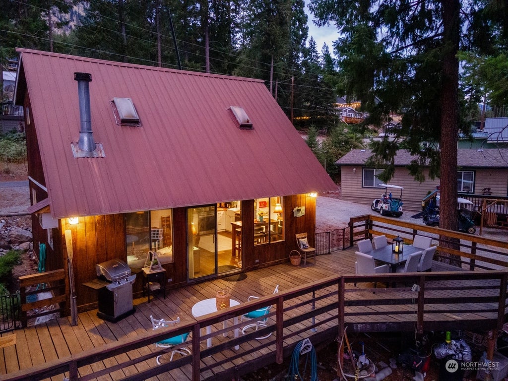 Terrific opportunity to own a charming cabin-style home at the Lake Chelan Yacht Club on the sunny south shore of Lake Chelan. This 1,008SF home comes fully furnished and features 3 bedrooms, a professionally designed and thoughtfully remodeled kitchen w/ handcrafted finishes, beadboard walls, new cabinetry, appliances, butcher block countertops and lighting fixtures and 2 remodeled baths w/ new vanities, fixtures and glass door showers plus vaulted great room ceilings and large sliding doors that lead to a lake view deck and outdoor entertaining area, nestled amongst evergreen trees. The historic, multi-generational community offers a newly renovated marina, waterfront w/ private clubhouse, boat launch, moorage, community events and more!
