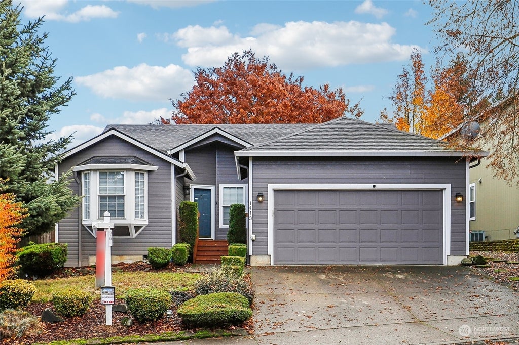 This welcoming charming home offers a formal living room with bay window, vaulted ceiling, flows into the formal dining room. The great room family room with slider to patio and yard. Breakfast bar stainless kitchen, including a dishwasher, built-in microwave, electric range, and refrigerator, ample cabinetry, including a lazy susan. The kitchen dining area with ceiling fan, radius window and vaulted ceiling. French door entry to the primary en-suite with walk-in closet, vaulted ceiling, a dual sink quartz vanity, combo soak tub and shower. Two additional bedrooms. Laundry closet. Full bath with granite vanity, combo soak tub and shower. New carpet, laminate and vinyl flooring. Front porch, back patio, 2-car garage, on a corner lot.