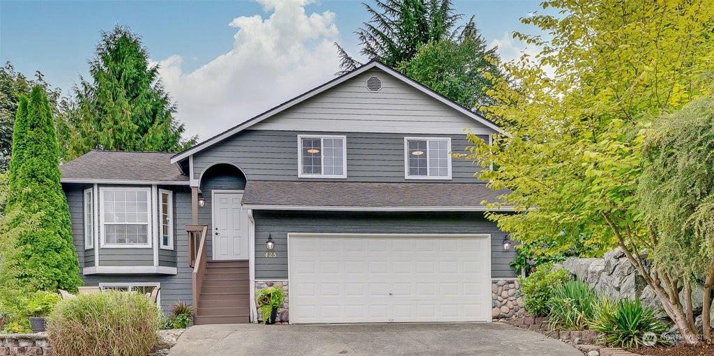 Beautifully situated above street level, nestled on a quiet Cul-de-sac, this home is move-in ready!The main level has a circular floor plan flooded w/natural light & vaulted ceilings: living room is punctuated w/ a gas fireplace, spacious formal dining room, Kitchen w/ SS appliances, newer smart fridge, breakfast eat-in space, & a slider door leading to the deck for morning coffee. This home offers 5 bedrooms, 2.5 bathrooms, primary bedroom includes en-suite bath and walk-in closet. On the lower level find family room w/slider door to patio & fenced level backyard, plus 2 more bedrooms & a flex space. 2 car garage w/ abundant storage! Enjoy the end of our summer days at Blackmans Lake, Nearby Centennial trail & Historic Snohomish.