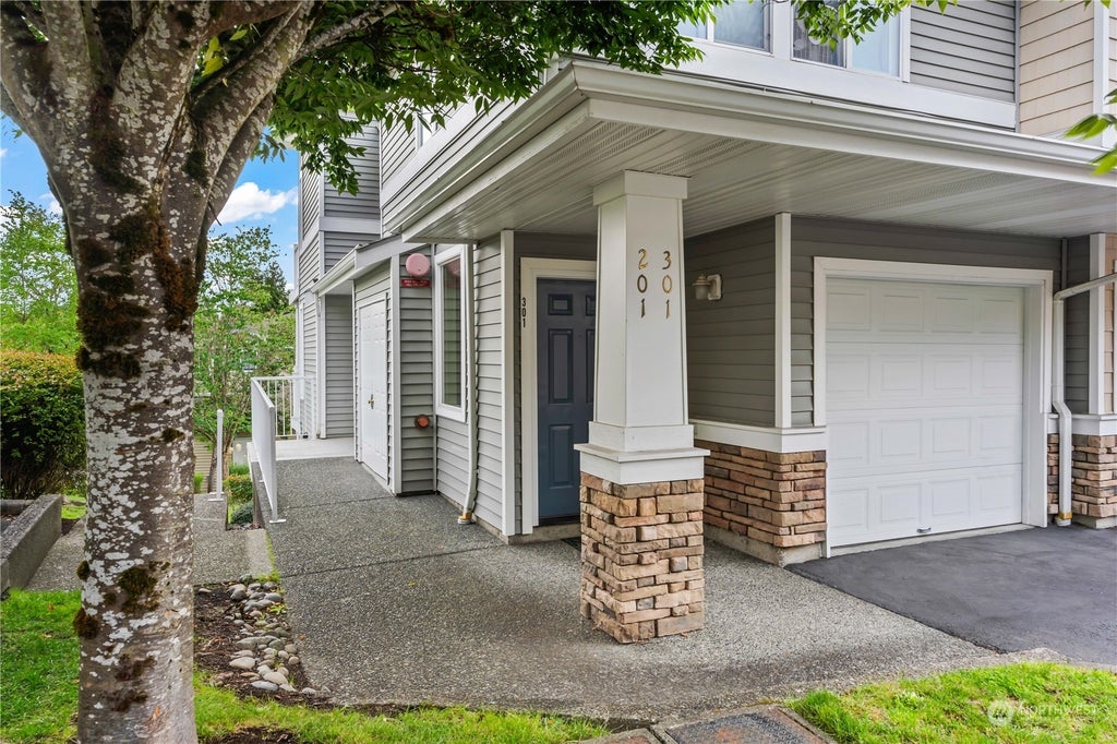 Spacious top-floor end unit condo offers open-concept layout w/high 10' ceilings, oversized windows & cozy fireplace. Step out onto your balcony to take in relaxing views or enjoy your favorite beverage. Kitchen features abundant cabinet & counter space, plus a convenient breakfast bar for casual meals. Primary bedroom suite provides a large walk-in closet & en-suite bathroom w/a double vanity. French doors leading to 2nd bedroom is ideal for home office, guest room, or additional living space. All appliances stay for a move in ready home. Attached garage w/additional storage & ample guest parking. Nearby trails, parks & playgrounds along w/easy access to shopping, dining, airport & freeways. FHA/VA-approved w/NO rental cap.