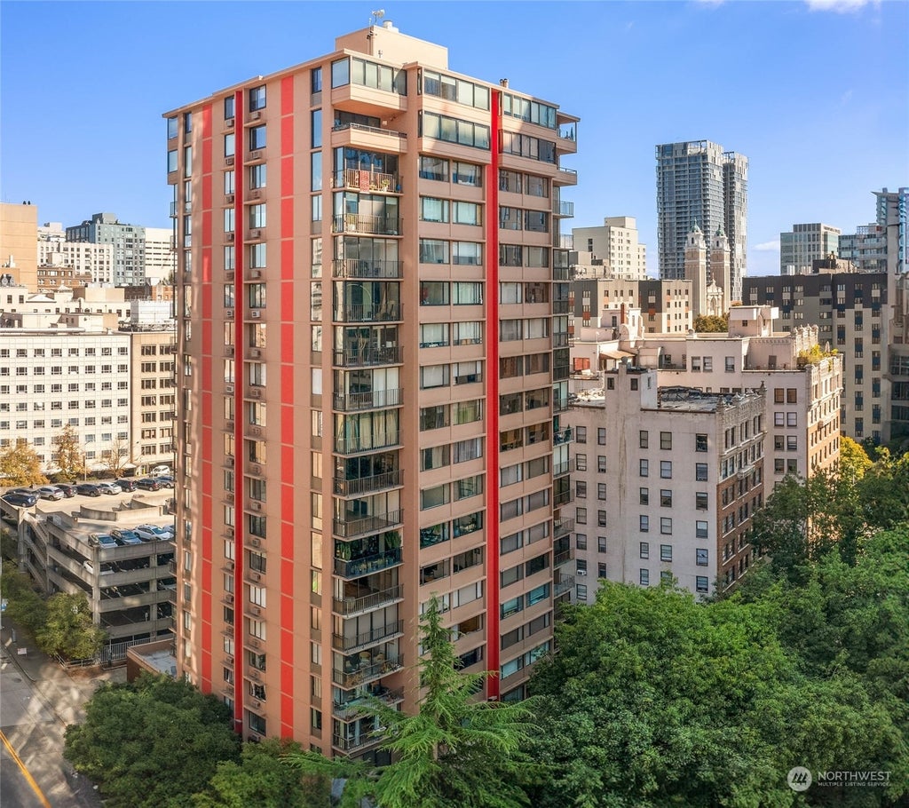Enjoy western city, sound, & distance mountain views high atop First Hill from this bright corner unit. The two-bedroom unit boasts new wide-plank flooring and paint. Master Suite with lots of closet space. Second Bedroom has custom office. Large view balcony, A/C in Living/Dining room, Fireplace, W/D in the unit, secured Parking & Storage. Resident amenities: On-site manager, Clubhouse, Gym, and outdoor Patio w/BBQ grills. Great location with in-city living, shopping, dining, and theater… experience all downtown living has to offer!