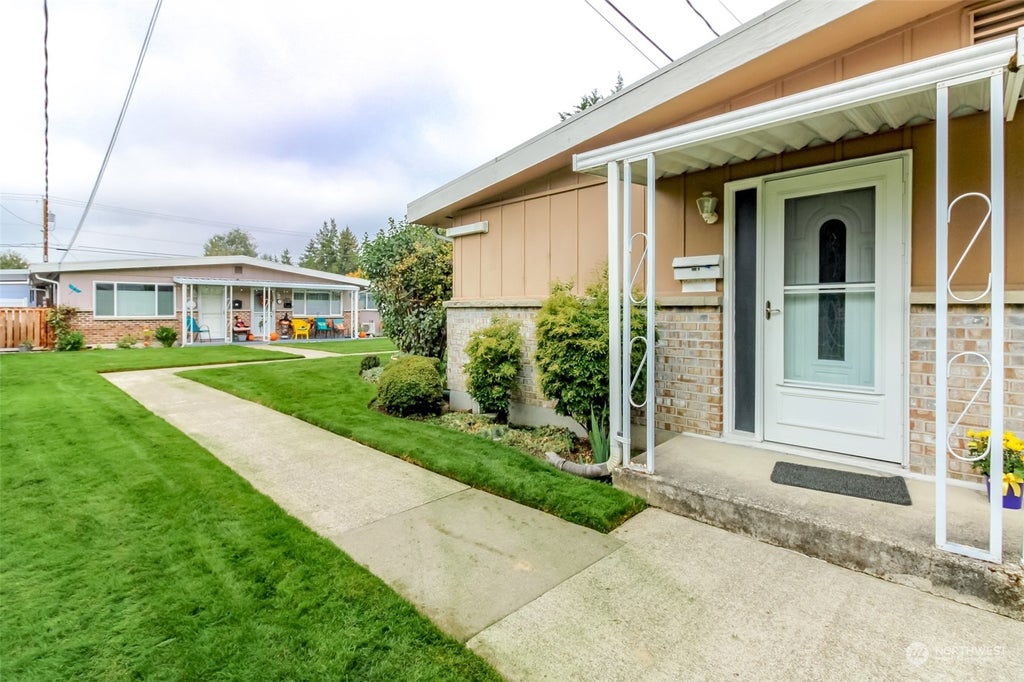 Come check out this cozy condo with the perfect location near downtown Puyallup. This 55+ community is quiet and loved by all that live here. Close to shops, restaurants and quick access to Hwy 512. Enter in to a very nice sized living room and dining space that is perfect for you and guests. Kitchen includes all necessary appliances and a stacking washer and dryer. Sizable Primary bedroom has a large closet. Bathroom contains an easy access, updated shower. West window has awning for evening shade. You can personalize and maintain the gardening space around your unit. Enjoy the covered patio with newer roof. HOA dues cover lawn mntnce, sewer, garbage, water and taxes. This unit includes a carport spot and storage space.