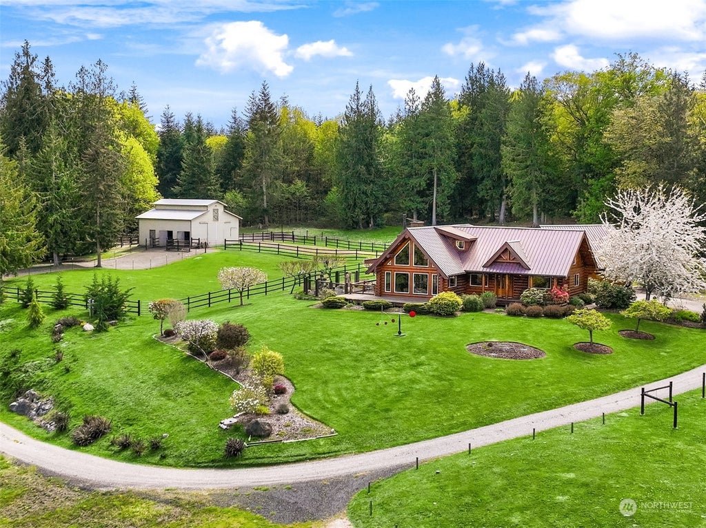 Welcome to paradise atop the hill, overlooking Chimacum Valley. An immaculate home on 6.43 acres, ready for a new owner. Vaulted ceilings & breathtaking views of Mt. Baker W/floor-to-ceiling windows, granite countertops, a farm sink & Heartland appliances. A wood stove & beautiful cherry floors W/radiant heat. The primary bath has marble & basalt details, a Japanese soaking tub & a walk-in closet. A wrap-around Purple Heart wood deck, A Zen-style fenced garden, a covered patio. The detached 2-car finished garage offers a breezeway to the home & has a room above. There's peach, apple, and cherry trees, a 4-stall barn W/loft, 7 paddocks, a chicken coop, wood storage, a custom round pen, wood rail fences & more; just minutes from Port Townsend