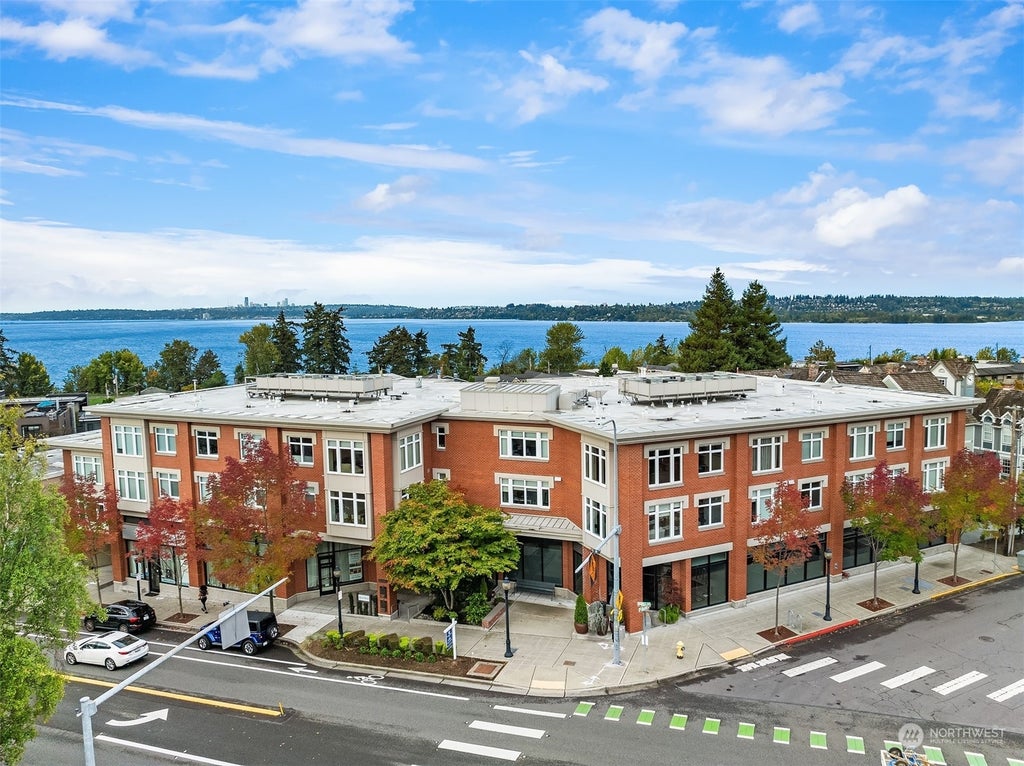 Welcome to Kirkland's desirable West of Market Leland Place. A prized steel & concrete constructed, low-rise complex with a desirable walking score of 86%. With zero-entry stairs & 10ft. ceilings, this elegant, one-level corner unit shines with natural light from gorgeous west-facing windows. A modern chef's kitchen boasts granite countertops, Pedini cabinets from Italy, Bosch gas cooktop & brand new side/side Whirlpool refrigerator. Stunning hardwood floors flow throughout w/brand new carpet in bedrooms. Primary bedroom enjoys custom walk-in closet & luxurious ensuite w/soaking tub. Enjoy quiet mornings & evening meals on private covered deck. Built-in office nook. Full size W/D. AC. Gated common garage w/2 side-by-side stalls. Strong HOA.