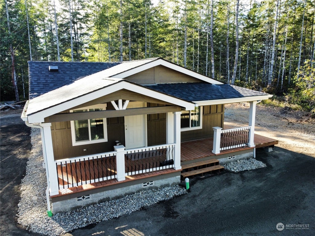 Brand NEW 2024 3BD/2BA well-designed open concept MFH sitting on stunning serene 2.5 terraced Acreage surrounded by mature Evergreens. Plenty of area for your shop, garden areas & tree forts! Features include big covered front deck entry & side deck off the Kitchen area. You'll find a big size island in the kitchen w/SSApps, ample cupboard space/drawers. This home boasts nice Primary BD w/private ensuite & walk-in closet, gorgeous ambient light thru tall windows. RV hookups! BVE has a community beach lot on Hood Canal for members. NO HOA. $300 for RMA only. Driveway's topped with 3/8"minus chipped black Basalt.