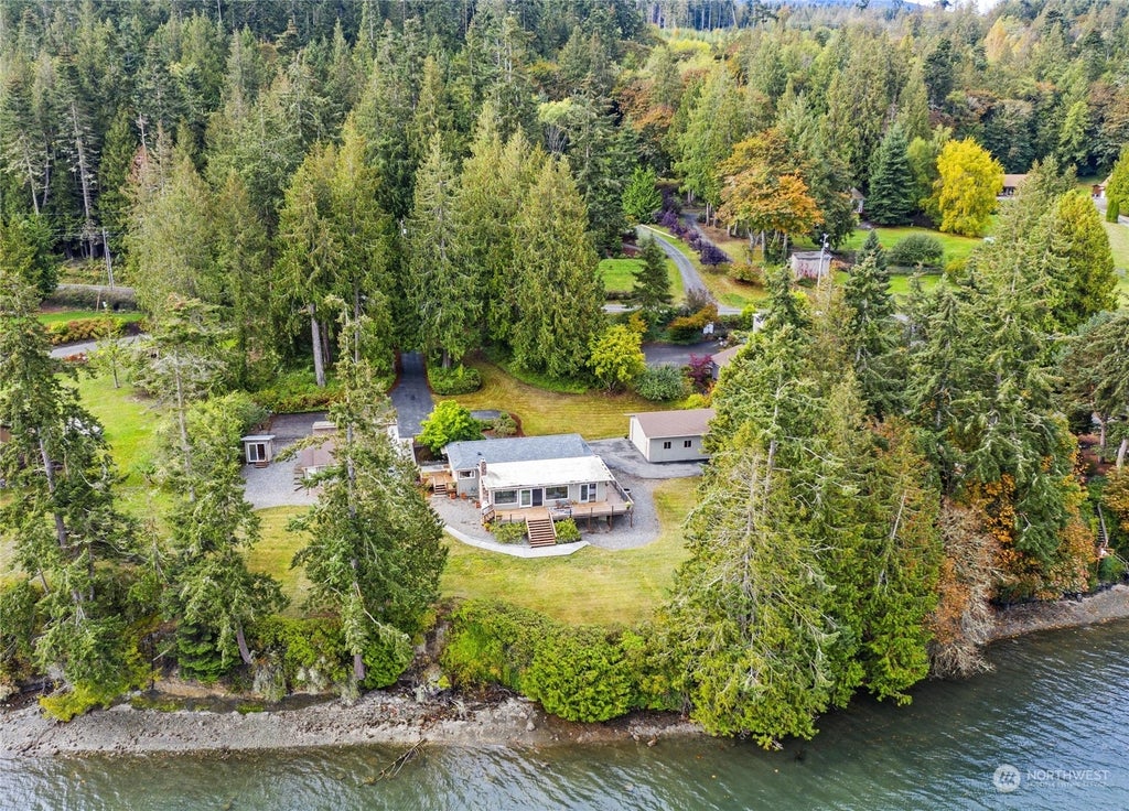 Discover over an acre of tranquility on the shore of Sequim Bay, featuring 304 feet of waterfront & stunning views of the Strait of Juan de Fuca. Located near John Wayne Marina & the scenic Olympic Discovery Trail, this beautifully remodeled one-story rambler boasts 2 bedrooms, a den, & a versatile detached studio space perfect for guests or hobbies. The living area features a cozy fireplace in an oversized great room which flows seamlessly out onto a newly updated deck & custom-built stone fire pit area, all ideal for year-round entertaining. Additional highlights include a spacious detached garage, large carport, charming potting shed & three paved RV/Boat parking hookups. With tideland rights included, this serene retreat is a rare find!