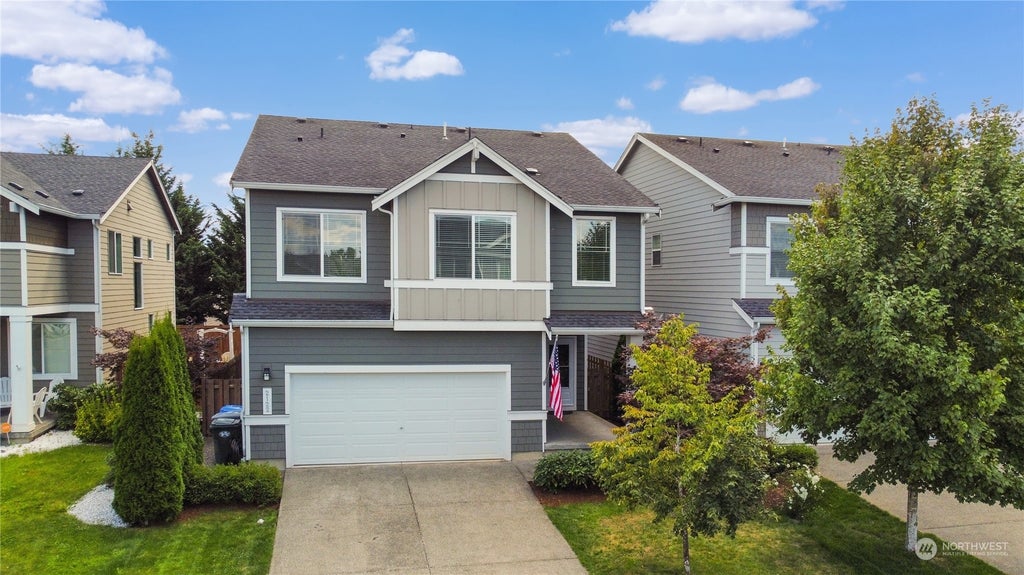 Light & bright home w/ 4 bdrms plus bonus room is sparkling clean and ready for new owners. The first thing you'll notice about this great home is the large covered front porch - perfect for welcoming guests or holiday decorations. Inside features an open concept first floor, a large living space w/ gas fireplace, a huge kitchen overlooking the backyard w/ an island & a new refrigerator, plus the home is freshly painted inside and has brand new carpet! The bonus room is huge and perfect for a 5th bedroom, playroom, craft room, game room, etc. Primary bdrm w/ 5pc bath & walk-in closet. Efficient heat pump/central AC & tankless hot water! Upgraded extended patio for outdoor living. Located on a double culdesac. Close to schools, stores & JBLM