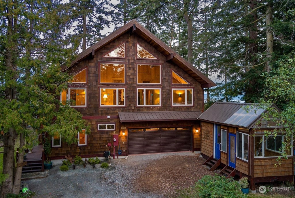 Experience the ultimate in Pacific Northwest living with this extraordinary lodge style waterfront home. Awe-inspiring views of Saratoga Passage & majestic Mt. Baker. Thoughtfully designed & professionally engineered, this residence is a true masterpiece. Crafted with an emphasis on natural light & high-quality materials, featuring 46 strategically placed windows, true wood beams, elegant Tigerwood & marble floors, low to no VOC materials, and in-floor heat. The main floor rests on a concrete slab, the exterior showcases cedar shingle siding complemented by a metal roof. Gourmet kitchen w/granite counters & commercial range. The 2nd floor primary impresses with its soaring 35-foot ceilings. Your community beach is just steps away!