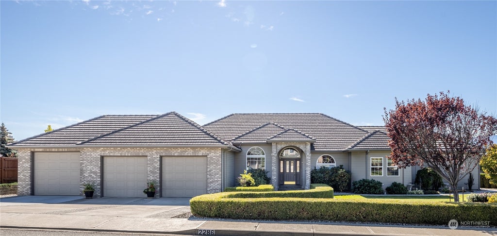 Nearly 3000 square feet, all on one level, situated on a very private .80 acre lot. Beautiful views from the property. Inground pool. Granite and tile kitchen surfaces, stainless appliances. Large primary suite with and extra room that could be home office or gym. Large formal living room with fireplace, family room off the kitchen. Two dining areas. Two bedrooms on opposite end of the house from the primary suite, plus a custom office space with desk. The grounds are beautifully manicured, with perimeter hedges, garden space, and automatic sprinkler system