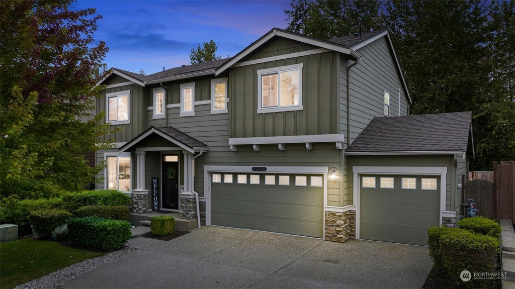 This stunning, better-than-new home is just one block from Alan Yorke Park on Lake Tapps! Enjoy a freshly updated interior w/ brand new carpet & paint. The main floor features a bedroom & ¾ bath, along w/ an open-concept layout that flows into a spacious kitchen with nearly new appliances, gas range & a large walk-in pantry. Upstairs, the expansive primary suite boasts a spa-like bath and walk-in closet. The backyard, which backs to a peaceful greenbelt, is ideal for entertaining with a huge patio. Additional highlights include A/C & generator-ready setup. Just a short walk to the park for swimming, kayaking, pickleball, basketball, the skate park & Bonney Lake nights summer concerts. Conveniently located near schools, shopping, and dining!