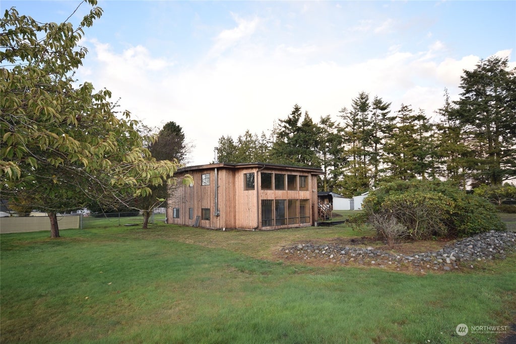 Unique solar design allows for your imagination to create the space you desire. Listen to the waves crash on the spit & view the water from the deck. Lovely Mains Farm offers lots of quiet, peaceful living & enjoyment of the view of the Strait from the neighborhood waterfront lot. This home has an entrance on the main level & upper deck level. The main level has the sunroom/creative room, family room & laundry & additional room. The upper has the kitchen, dining, primary bedroom, primary bath & guest room. Lots of room for an additional garage or expansion.