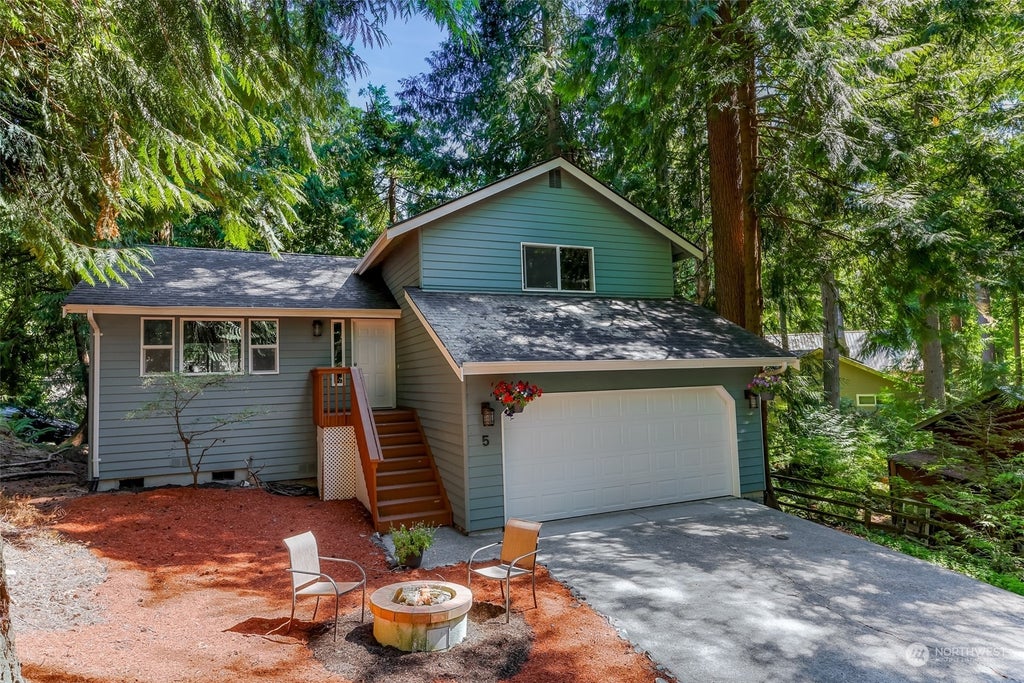 Charming 3-bedroom home in a quiet culdesac with a water fall trail just out your door that leads to miles of other trails! On entry, you're greeted by an open-concept living space with vaulted ceilings, large windows & an upper deck with a scenic overlook. The chef's kitchen featuring custom-quality cabinets w/full extension drawers, island breakfast bar & quartz counters complete this beautiful space. Head upstairs to two bedrooms with large walk-in closets, including two walk-ins in the primary suite. Walk downstairs to another bathroom & bedroom with its own deck leading to a fully fenced yard. New interior paint throughout. So much to enjoy living in Sudden Valley, marina, parks, lake access, dog park, beaches, gym & more!