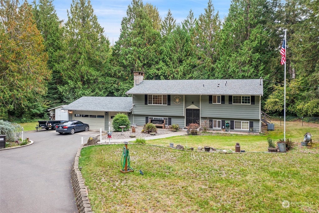 3.5 acres, conveniently located on the south side of Shelton. 2397 sf, 2 primary bedrooms (w/bathrooms), 2 more rooms with closets, 2.5 bathrooms, living room, kitchen w/bar, dining room and a laundry room. The lower level primary bedroom has a large walk in closet (not pictured). Wall in living room is beautiful 100 year old barn wood. Updates since 2020, plus a new roof, furnace and heat pump. Paved circle drive, landscaped, greenhouse (w/utility sink, power and lights), outbuilding, private well and 3 car finished garages. RV parking w/20 amp power and water hookup available. This is a must see home with too much to show in only 40 pictures!