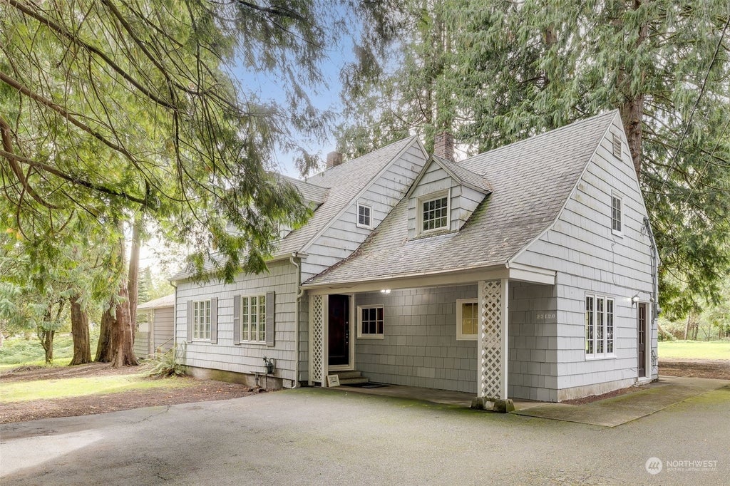 By Appointment Only! English Cottage-style, 2,329 sq ft home on 3.44 acres in Bothell’s Canyon Park neighborhood. Four-bedroom, three bath home features living room with gas fireplace, large kitchen with bar seating, dining room, and flexible spaces, inc. 266 sq ft bedroom/family room/office with separate entrance. High ceilings with massive wooden beams; vertical grain fir, oak, slate and tile floors in living areas; built-in storage throughout. Attached 2-car garage w/ loft and carport, plus RV parking. Estate-sized property features greenhouse, expansive backyard, and running stream, and offers enormous potential with no CC&Rs and R9600 zoning (expansion, development, equestrian, farm potential?). Located in Northshore School District.