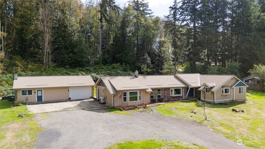 This home is anything but ordinary—truly one of a kind! Recent upgrades include a newer roof (2020), electrical panel (2022), dual head heat pump (2022), all new windows (2023). Inside the home there is plenty of architectural charm with wood ceilings & exposed beams. Oversized primary suite has its own bathroom and room for office desk. The sunken living room boasts a cozy brick fireplace, while the kitchen is equipped with granite countertops and new appliances. Additional living room allows for multi-media entertainment. Large dining room with a wood stove has vaulted ceilings and offers more functionality. Detached two-car garage with a bonus room. Set on 1.33 acres, the property consists of two lots for development potential.
