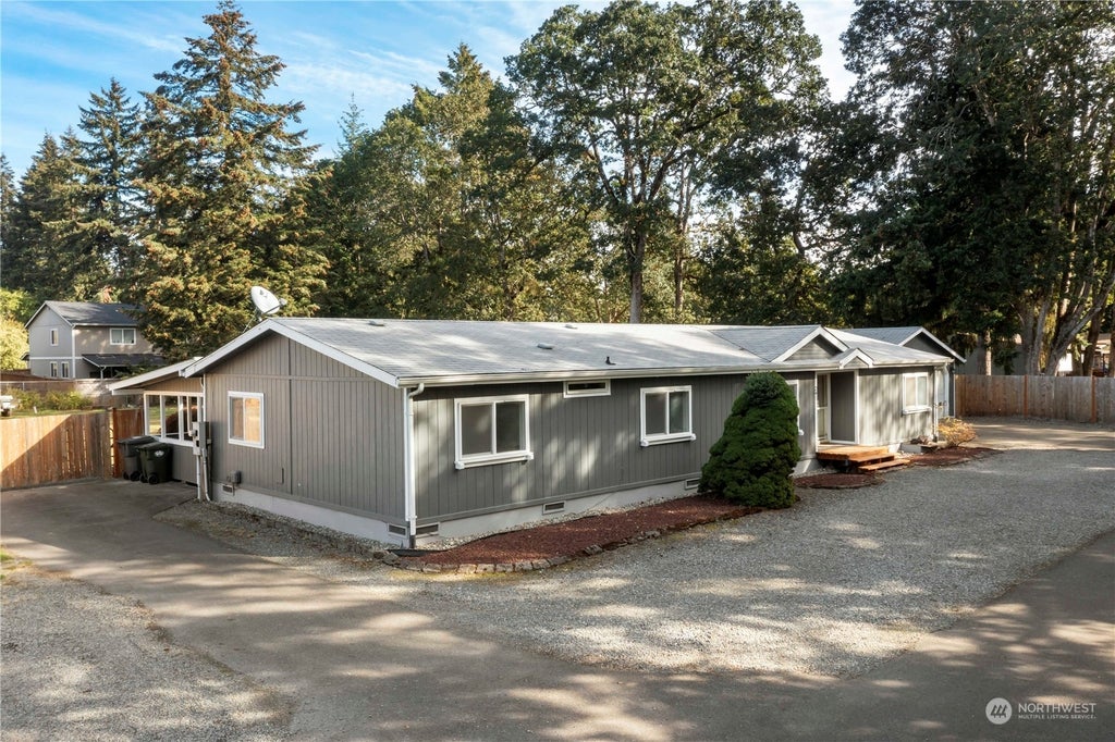 Perfectly maintained 1769 Sq Ft manufactured home on over half acre lot with 768 Sq Ft garage/shop. Walk inside and fall in love with the open floor plan, vaulted ceilings. Spacious primary bedroom comes with walk-in closet & private bathroom featuring shower, tub & vanity. Second bedroom located on opposite side of home. Large office/den includes closet. Walk outside onto a 384 Sq Ft deck & make your way over to the huge detached shop/garage, includes lots of electric hookups, lighting, etc. Tons of room for your RV parking, boat & toys. Home located at the end of street. Listing broker is providing one year home warranty!!