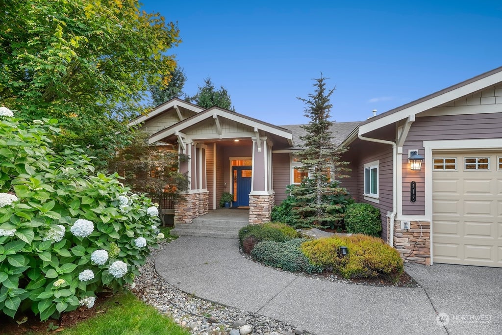 Come home to this custom-built classic craftsman located in the exclusive White Horse golf community! Enjoy main floor living with cozy den, private office, gourmet kitchen, and spacious primary suite featuring vaulted ceilings, balcony access and a stunning spa-inspired 5 piece bath. Downstairs boasts a generous living area with kitchenette, 2 bedrooms, and guest bath. Ultimate PNW living with a large main floor balcony, covered porches, masterfully designed park-like grounds, mountain and sunset views. Cherry wood floors, custom cabinetry, granite countertops, wine storage, and main floor laundry. Multiple walk-in closets, dedicated storage room, and attached garden shed. Country living with easy city access via the Seattle fast ferry.