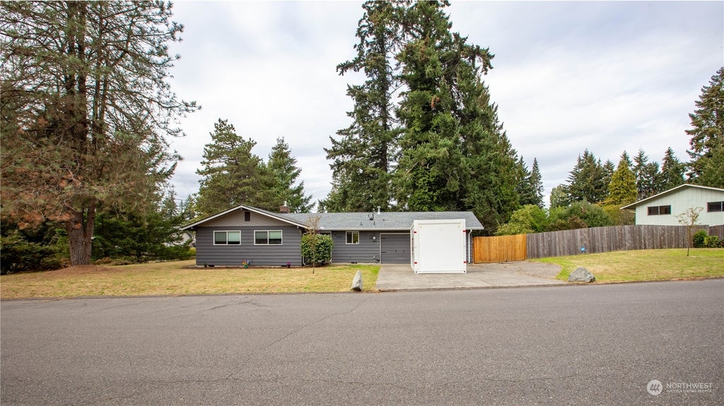 Classic mid-century modern home perfectly remodeled ready to enjoy. Stress-free living in a fully remodeled kitchen includes quartz countertops, white soft close cabinets, new ss appliances w/ gas stove. New floors throughout include water-proof laminate in living area, luxury vinyl planking in baths w/ new walk-in shower & 3/4 bath. Open layout in the living room which includes new windows for natural light w/ bali blinds throughout the house or nestle up by the gas fireplace & keep cozy. Canned lights, AC throughout & blackout blinds in all bedrooms. Finished bonus room w/ lots of possibilities. Fully fenced .27 ac corner lot includes 1 paved RV spot, fire pit area, shed & fruit trees. New roof, gutters w/ leaf filter & furnace.