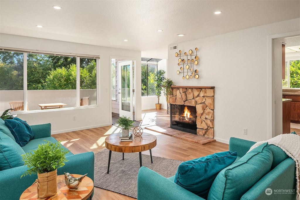 The Gardens in Shoreline. Super sunny, south-facing, top floor, quiet, territorial views, fully updated corner unit. Fresh remodel just completed! All new LVP flooring, crisp paint, trim, solid core doors, LED lighting. Large primary bedroom w/large new en-suite bathroom w/quartz counters, undermount sinks & large closets. Large bright living room, wood fireplace, eat-in kitchen w/breakfast bar opens to sun/dining room. Laundry room, relaxing private covered patio & lots of closet storage. Carport parking, elevator, storage room, new roof currently being installed. Convenient location, two blocks to Trader Joes & 1.5 miles to new light rail station. Welcome home.
