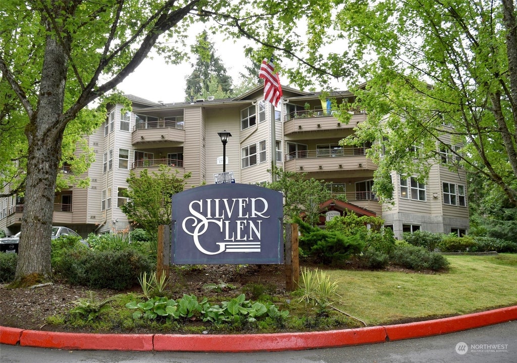 Enjoy the sunset and tree-top views from your personal patio, bedroom and living areas in this top floor unit. Large living area easily accommodates dining room set along with living room furniture. Spacious bedroom fits a king bed, other bedroom furniture and has access to the patio. Double sink in kitchen with ample storage and counter space. The bathroom has an accessible shower and stacked washer and dryer. Choose your own carpet and paint. Garage storage and parking included. This vibrant 55+ community offers numerous on campus activities and events. Located in the heart of Bellevue, there is easy access to shopping, dining and cultural activities.