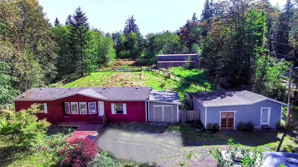 Presenting this unique property that includes a 3 bedroom, 1.75 bathroom open layout manufactured home with a detached dwelling (with kitchen, W/D, 3/4 bath) next door and a 4 stall, 40'x50' barn in the back of the 5.8 acre property. The property has a privacy gate at the end of a private drive off the main road for optimal seclusion. There is plenty of natural light to enjoy with all the large windows especially in the family room. The primary bedroom has its own bathroom & walk-in closet. Another living room is right off the entry. The carport was enclosed to be built to a finished room previously used as a theater room. There is great sweat equity here while offering an opportunity to create & update with your own personal touches.