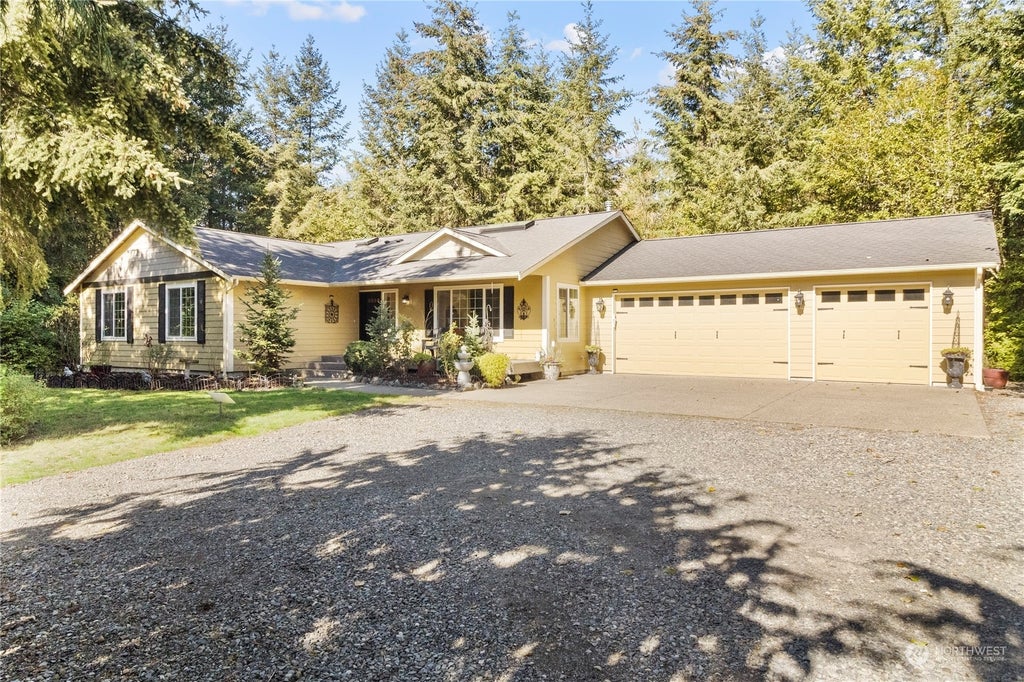 Nestled on over 6 acres of lush, tranquil forest, this beautiful Rambler-style home offers a peaceful retreat with endless potential. The open-concept layout seamlessly connects the spacious living room, kitchen, and dining area—perfect for fun gatherings or cozy nights in. This home has so many must see features from the relaxing ensuite primary bathroom, to the oversized 3 car garage. Whether you're into gardening, homesteading, or simply seeking a quiet escape, this property has it all- chicken coop, large planter garden with perennials, and a hidden pond only add to the outdoor allure. Bring your vision + watch it thrive in this serene, picturesque setting! While only being 5 minutes to 1-5 and 15-20 minutes to Lacey/Olympia.