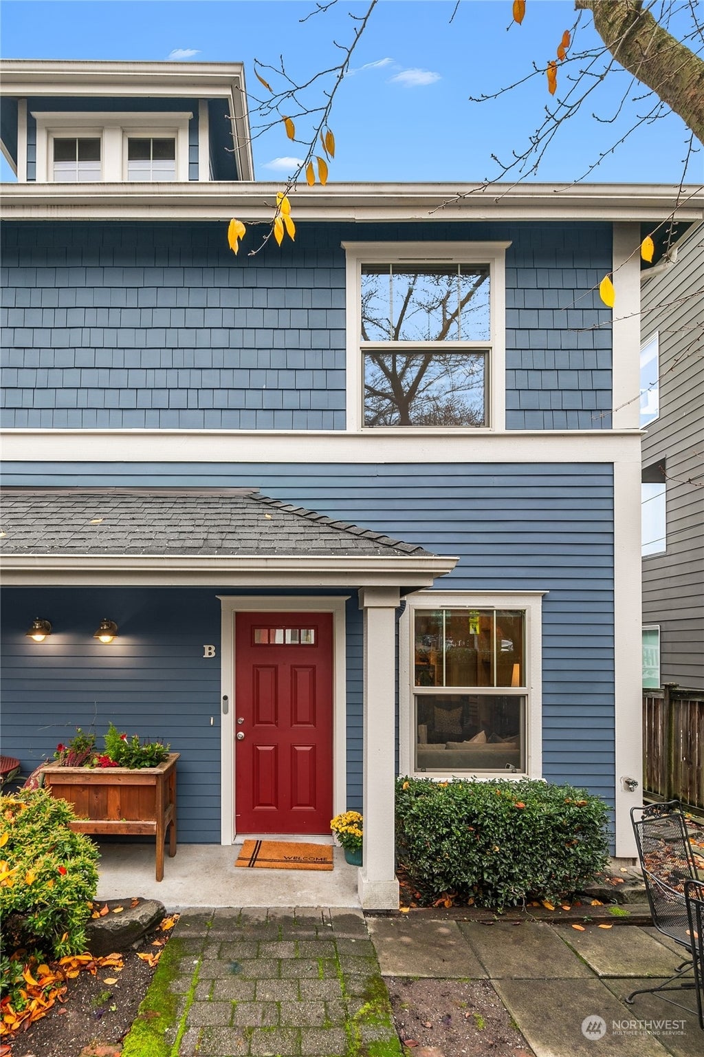 Prime Ballard location! Mature landscaping welcomes you into courtyard where you can enjoy barbecuing, gardening and entertaining friends. Open the front door to your open living space with engineered hardwood floors. Get ready to cozy up and enjoy the gas fireplace this Fall. Kitchen features stainless appliances w/ gas range. Large pantry area. Powder room on the main. Upstairs find two large bedrooms with Jack n' Jill bathroom. Bathroom has 2 vanities & tile shower with soaking tub. Great closet space. Fresh new paint & new carpet. New hot water tank. 1 dedicated parking spot & storage shed. Close to amazing food, bars, coffee, Ballard Market, transit and more!