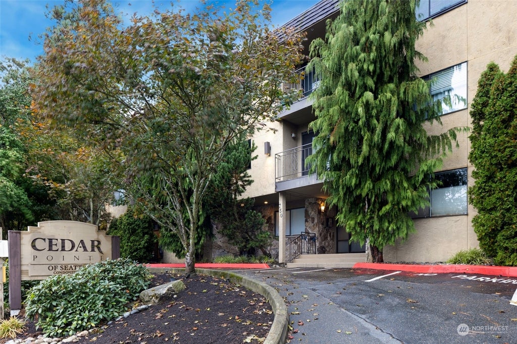 Amazing opportunity for a great deal on a 1-bedroom condo at Cedar Pointe: This spacious gem is 1 of the largest 1-bedroom units in the complex. Including a dining room, living room w/ natural light, a bedroom w/ large closet, & a deck overlooking a courtyard. This beautiful kitchen includes new appliances. A thoughtfully designed built-in desk space, provides the perfect office nook. Expansive mud/laundry room, complete w/ a newer full-size washer & dryer. A well-run HOA boasts low dues & amenities include updated fitness room, elevator, & gated parking. This secure building has it all. Plus, excellent access to shopping, dining, transit, & entertainment, w/ a park directly across the street. This Cedar Pointe treasure is waiting for you.