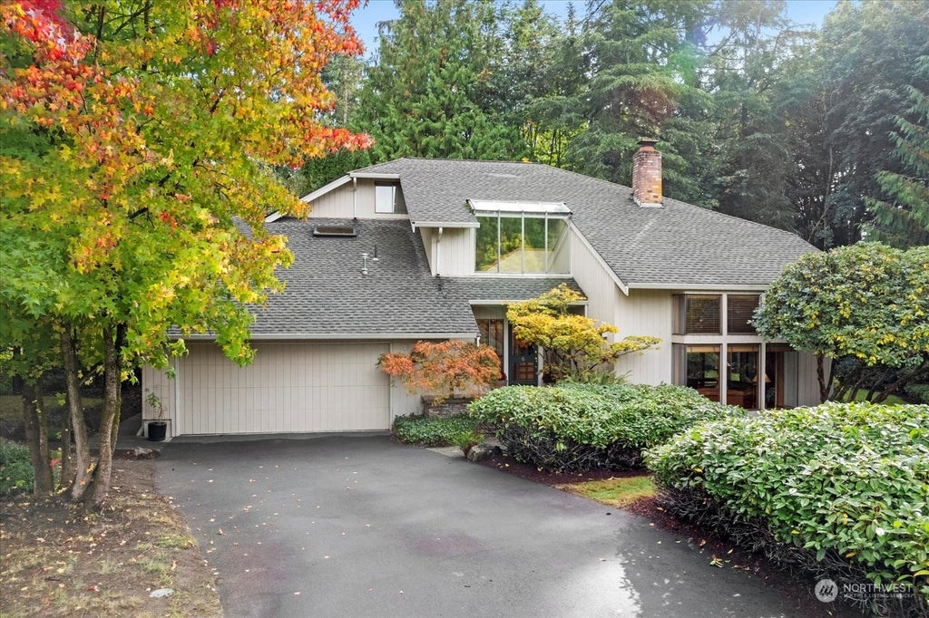 Quintessential Woodinville, NW contemporary lodge like home. Tall ceilings with warm wood beams and accents greet you. Huge windows to capture the natural setting. Large stone wood fireplace with rustic mantel. The 2nd floor features an open and remodeled kitchen and island, wonderful for entertaining. Open dining area and a family room with gas fireplace and tons of built ins. French door to deck overlooking greenery. Next level features a cozy TV room w/ wet bar and an attached office. Top floor features the bedrooms, full bath and primary suite with attached bath and balcony overlooking the tranquil backyard. All set on a shy acre, minutes to downtown Woodinville, wine country, restaurants, easy access to 405. This is a special property!