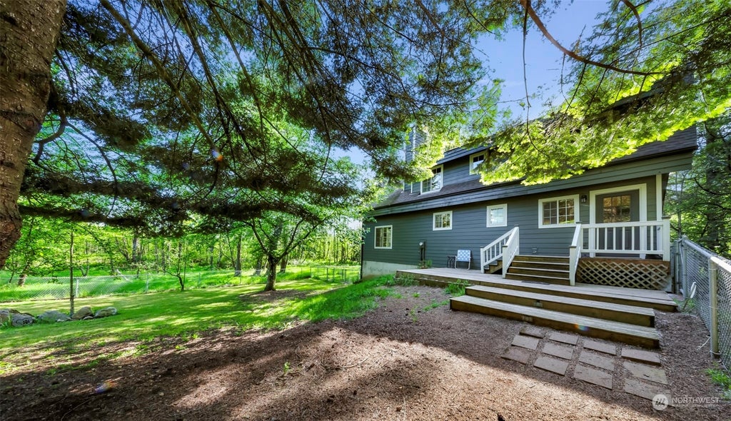 Welcome to this cozy, rustic retreat amongst the trees. Just 10 minutes from downtown Blaine, this nearly 5-acre property at the end of a quiet private road offers unmatched privacy. Enjoy the covered porch, your own pond, and a seasonal creek. The main floor has a primary bedroom, with two more bedrooms upstairs. The 1100 SF walk-in basement offers storage and leisure space, plus a framed room for an office and an unfinished bathroom. The 28'x32' shop stores your tools, including the John Deere riding mower and its accessory trailer that convey with the home. Multiple fenced areas ensure your pets stay safe. Recent upgrades: new Hardie siding (2023), new septic system (2015), and a newer roof.
