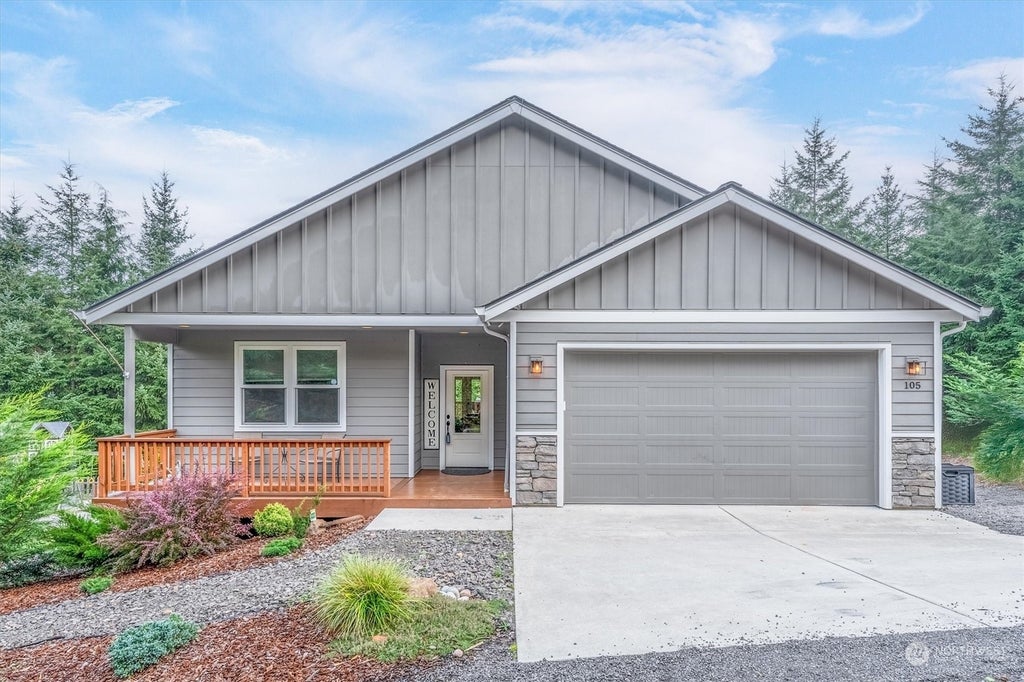 Looking for a little peace & quiet? Look no further! This contemporary one level home is just right! This beautiful home is situated on 3.29 secluded acres. The home boasts vaulted ceilings, a great room concept and LVP flooring throughout. The living room has a very nice gas fireplace and French doors leading to the back deck. The kitchen features custom soft close cabinets, quartz counter tops, pantry, smoked stainless appliances and an island with an under mount sink and breakfast bar space. The primary suite has double closets (one walk-in) double sinks and a spacious tile shower. The home has high speed internet forced air heat with heat pump. The home is nestled in a treed setting with a circle drive and RV Parking. Come see!