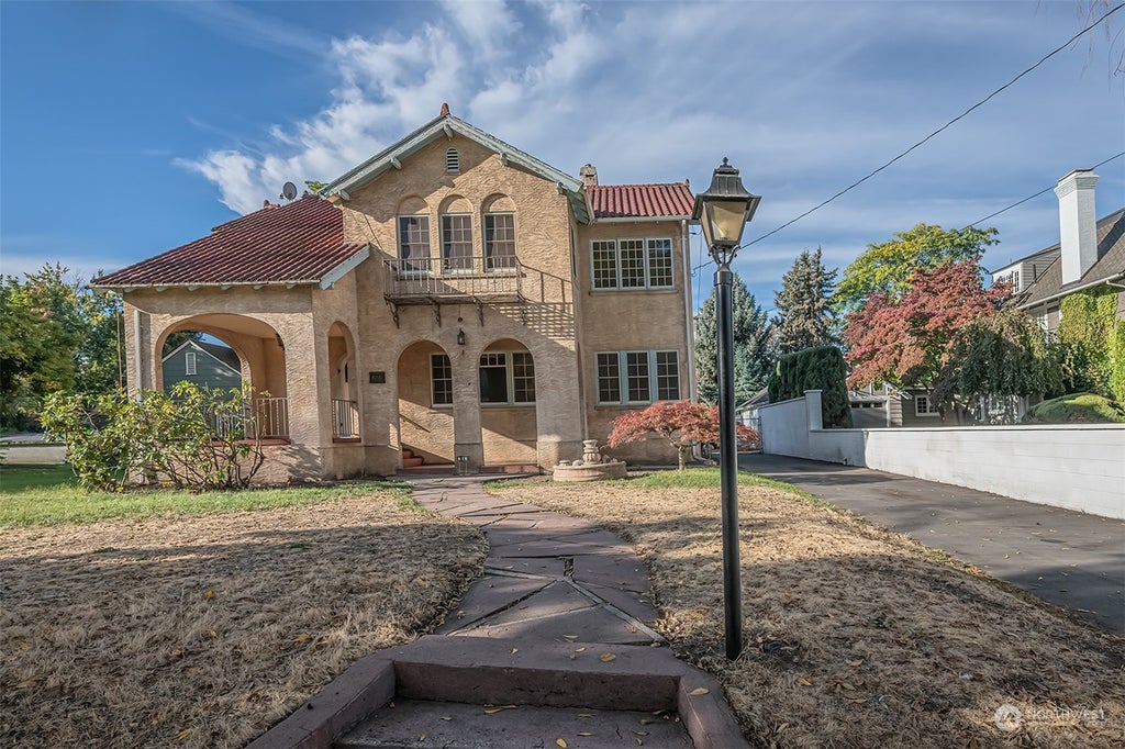 Don't miss this rare opportunity to restore an Icon of Historic Palouse Street. Vintage 1900 Spanish/Mediterranean style 4897 sq. ft. home on a large 14,000 sq. ft. lot w/fenced backyard and detached garage/shop. Beautifully refinished hardwood floors throughout main & upper levels w/ elegant banister staircase. Impressive & unique Cloister Barrel vaulted ceiling in living room w/ wood burning fireplace & 3 French doors. Large formal dining room w/ plenty of window area for great natural lighting. Servant stairwell off kitchen leading to upstairs. Spacious primary bedroom boasts a 3/4 ba. & large walk-in closet w/double sunrooms divided by French doors. Basement has separate entry & 3/4 ba. w/ plenty of options for added rooms & wine room.