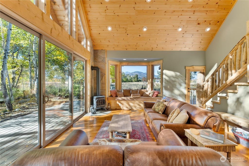 Experience the tranquility of mountain living in this stunning riverfront property. This 3-bedroom, 2.5-bathroom home boasts breathtaking mountain views & a picturesque combination of aspens & pines surrounding the house. Step onto the wrap-around deck & immerse yourself in nature, or simply relax in the comfort of the cathedral ceiling with wall to wall windows, perfect for observing the local wildlife. The interior features custom log & pine accents, as well as a mix of tile and wood flooring. The primary bedroom on the main floor offers a stunning view and a cozy propane fireplace. Additional amenities include a screened-in porch, a generator, & an EV charger. Take advantage of the opportunity to make this mountain retreat your own.