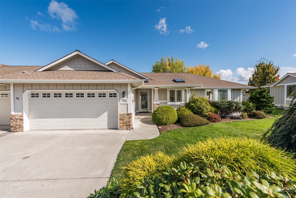 Rare condo in Sherwood Village Camden Ct VII: single-level, carefree living with a 3-car Garage & partial Olympic Mt Views! A welcoming covered Entry porch segues to the open-concept Great Room with vaulted ceiling, propane fireplace and loads of SE windows looking out to the private, fully-fenced patio with tranquil water feature & abundant greenbelt beyond. Updated Kitchen with neutral Corian counters, Subzero refrigerator, walk-in Pantry, breakfast bar open to the view-oriented Dining area. Hardwood floors in main living areas. Spacious Primary Ste with patio access, walk-in closet, ensuite bath PLUS 2 additional bedrooms, full bath, & laundry. In-town convenience with great walkability & a short stroll to the Olympic Discovery Trail.