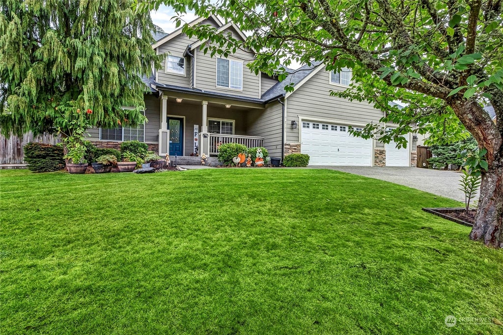Incredible curb appeal and luxury starts here! Immaculate 2654'sq ft 4 bedroom on private .26 acre lot. New roof 2024. Soaring 2 story entry, spacious living/dining rooms, beautiful updated kitchen, Quartz counters, built-in coffee bar off utility rm. Separate den w/double doors & full sized ADA accessible bath. Upper Floor: New Carpeting. Primary Bedroom, remodeled luxury bath + Bonus rms & walk-in closet. 3 more bedrooms & 3rd full bath. White millwork, 6 panel doors. Fully fenced yard, mature trees, landscaping, fire-pit, playset. New composite deck w/lighting, covered gazebo, fenced yard, shed, party space, attached lawnmower shed. Huge 3-car garage, workbenches, cabinets. Across from community park, cul-de-sac and minutes to JBLM.
