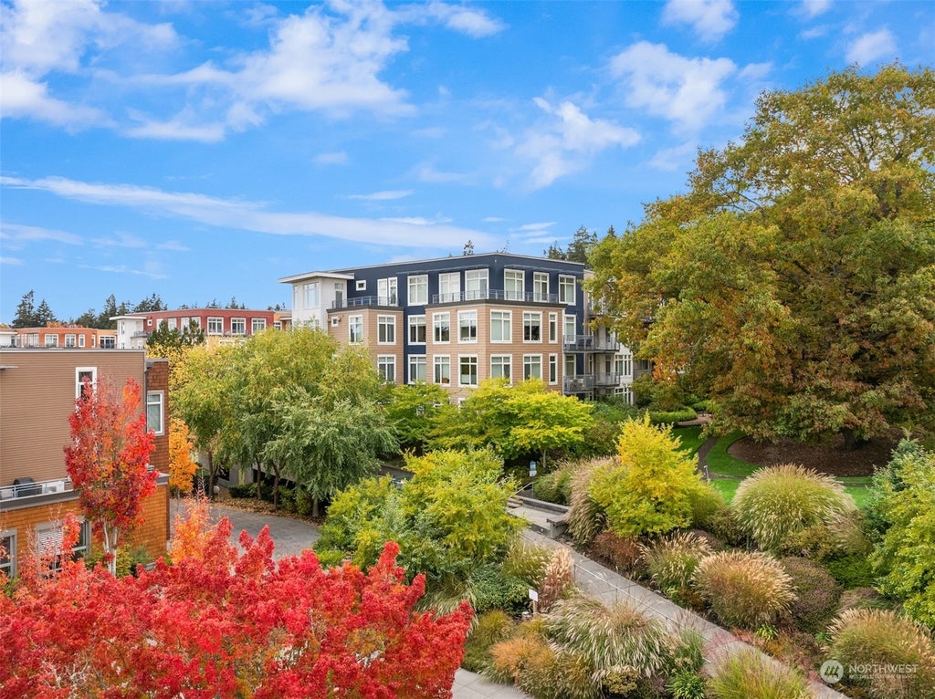 The perfect spot for in-town living. Harbor Square is in the center of everything! Across the street for an easy commute to Seattle, and excellent shopping of all kinds just down Winslow Way, from the Farmer's markets to the Bainbridge Island Museum of Art and wonderful bakeries! On the 3rd floor, looking out to beautiful lush trees for privacy and a sweet view of Puget Sound. Freshly painted and a perfect floor-plan. Hardwoods, great kitchen and stainless appliances. Excellent storage and large walk-in closet w/washer and dryer. Half bath for guest, and primary suite with grass cloth wall covering & full bath, w/another walk-in closet. The deck is perfect for relaxation and enjoying some sunshine. Private parking w/Tesla electric charger.