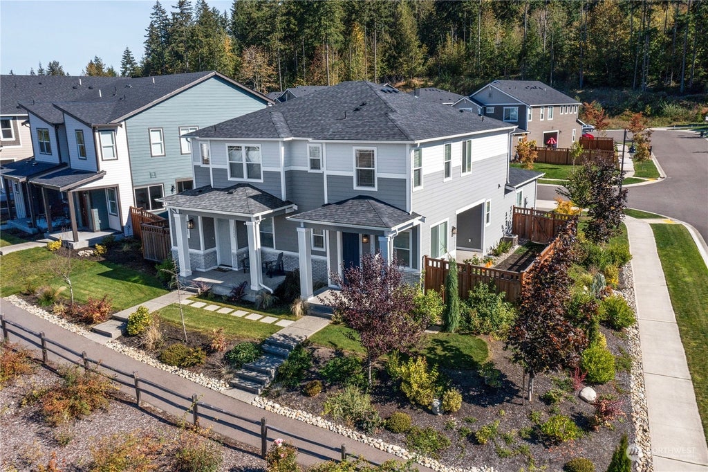 Don't miss out on this rare chance to own a previous model home situated on a fantastic corner lot. The main level of the this floor plan features spacious living and dining areas w/luxury vinyl plank flooring, a beautifully designed kitchen w/a pantry, large quartz island eating bar, a center-meet doors that open to a covered patio and a convenient powder room. Upstairs, you'll find cozy upgraded carpet, two nice sized secondary bedrooms, a light and bright primary suite w/a huge walk-in closet & a double-sink bathroom with upgraded tile throughout. Plus, there's a 2-car garage. This home is packed w/upgrades & extras! The community of Tehaleh offers parks, trails, community center & retail shops.